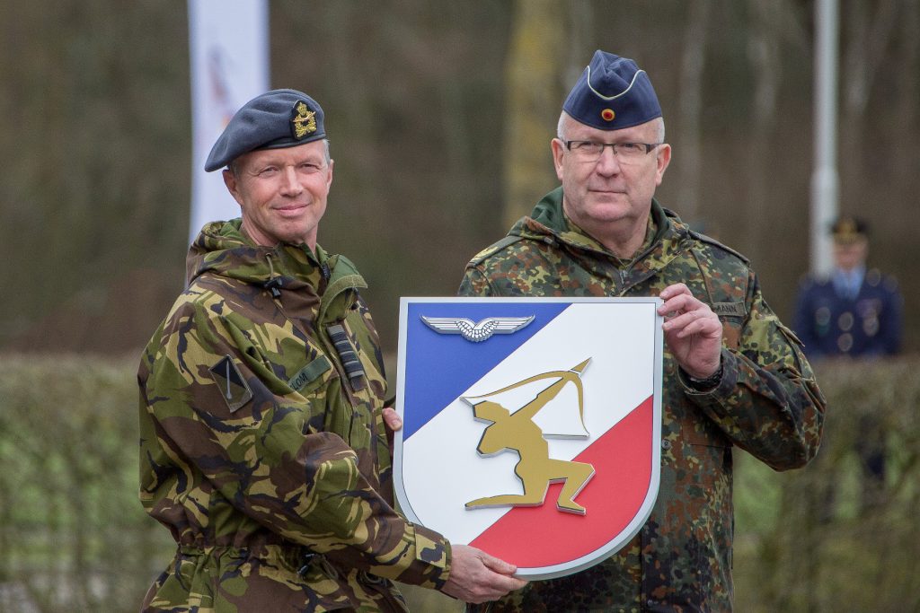Als Symbol für die Unterstellung überreichte der Kommandeur der bodengebundenen Verbände der deutschen Luftwaffe, Brigadegeneral Michael Gschoßmann, dem Kommandeur des niederländischen Kommandos, Kolonel Jan Blom, das Wappen der Flugabwehrraketengruppe 61. Außerdem steckten im Zuge der Zeremonie die beiden Ministerinnen drei bereits in den Niederlanden stationierten Soldaten des deutschen Verbindungskommandos das Emblem der DGLC an.