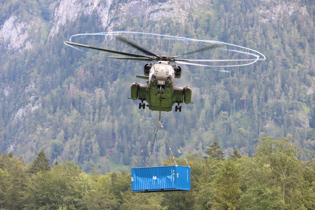 Langsam beginnt die CH-53 zu steigen. Die Gurte, die am Container befestigt sind, spannen sich, bis dieser vom Boden abhebt. Gekonnt stoppt der Pilot das Pendeln des Containers in der Luft und startet in Richtung Zielort durch. Der Auftrag, die Last ins Tal zu fliegen, ist eine willkommene Trainingsabwechslung für die Besatzungsmitglieder der CH-53 und verlangt ihnen ihr gesamtes Können ab. Denn so ein Container wiegt fast 2,3 Tonnen.