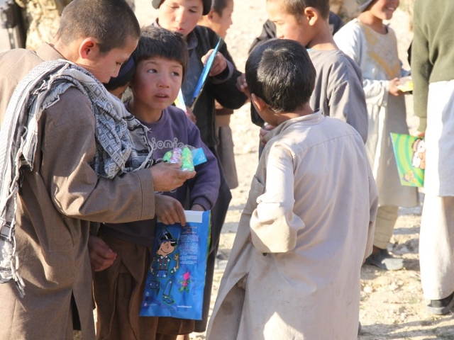 Nach dem Gespräch geht der „Chef“ von Taralay mit einer Botschaft für die Kinder zurück ins Dorf. 20 Minuten später hört man lautes Kreischen und Lachen. Eine Menge Kinder kommt voller Vorfreude rennend den Berg runter. Staub wirbelt unter den vielen kleinen Füßen auf und kurz danach stehen sie vor einer Kiste. Staunend und verwundert suchen sie sich einen Platz, um auf den Behälter von Oberleutnant T. schauen zu können. Es sind Spenden unterschiedlicher Absender, die an jedes Kind verteilt werden. Spielzeugmotorräder, Drachen und Aufkleber sind nur einige der kleinen Freuden.