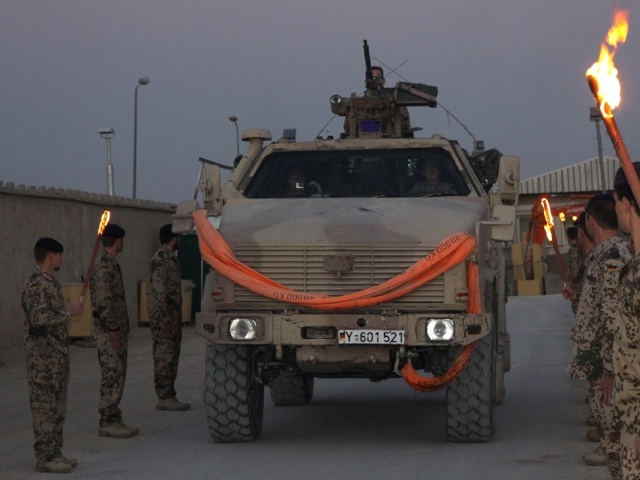 Szenenwechsel. Die letzte Patrouille der Objektschutztruppe muss jeden Moment durch das Haupttor kommen. „Fackeln an. Spalier stillgestanden, Augen rechts!“, ertönt es vom Kommandeur. Dann sieht man das erste Fahrzeug, das direkt in das Spalier einbiegt. Wehmut, Freude, Trauer und Erleichterung mischen sich zu einer faszinierenden Atmosphäre. Nach und nach erreichen alle Fahrzeuge des Konvois das Spalier. Hauptfeldwebel Sebastian K. erzählt: „Ich habe Gänsehaut bekommen, als ich mit meinem Dingo um die Ecke bog. Dieses Lichtermeer zu sehen, war atemberaubend. Zu wissen, dass ich Führer des letzten Konvois war, erfüllt mich mit Stolz. Das werde ich nie vergessen.“ Hinter dem letzten Fahrzeug fügen sich die fackeltragenden Soldaten zusammen und folgen. Der Schein der Fackeln schmückt die Kette an Soldaten, die auf dem Paradeplatz der Objektschützer zum Stehen kommt.