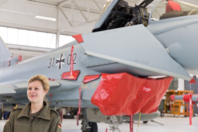 Hier treffen wir Stabsunteroffizier FA Andrea Rieken. Andrea ist 21 Jahre alt. Ihre Berufsbezeichnung ist monströs: Fluggerätemechanikerfeldwebel Eurofighter, Fachrichtung Waffen. „Ja, das ist schon ein langer Titel. Aber nicht nur dieser ist spektakulär, mein Arbeitsplatz hat es auch in sich.“ Hier in der großen Wartungshalle kümmert sich Andrea um den Eurofighter. „Ich bin in der sogenannten Instandhaltungstechnik eingesetzt. Bei der Instandhaltungstechnik liegt der Fokus vor allem auf der Funktionstüchtigkeit von Fluggeräten, das heißt man führt verschiedenste Funktionstests durch, repariert fehlerhafte Bauteile und montiert diese wieder in das Flugzeug ein.“ Bei dem Eurofighter handelt es sich um ein Kampfsystem. Und dieses Kampfsystem ist mit Waffen bestückt. „Damit diese im Ernstfall auch funktionieren, muss ich sie warten und prüfen“, so Stabsunteroffizier FA Rieken.