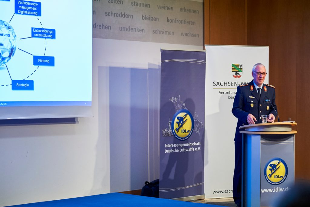 Es wird ruhig im Saal, alle Blicke sind nach vorn gerichtet. Die Landesvertretung Sachsen-Anhalts in Berlin-Mitte ist gut gefüllt. Rund 130 Gäste, darunter hochrangige Soldaten der Luftwaffe, sind anwesend, auch Vertreter aus Politik und Industrie sind gekommen. „Die Luftwaffe verfolgt bei der Digitalisierung einen ganzheitlichen Ansatz, der alle Elemente einbezieht. Dazu gehört z.B. neben den Projekten auch die Verfolgung der Technikentwicklung, Führungs- und Personalaspekte sowie Fragen des Systemischen Ansatzes bei „System of Systems“.Rieks stellte das Sich daraus ergebende Digitalisierungsrad eingehend da.