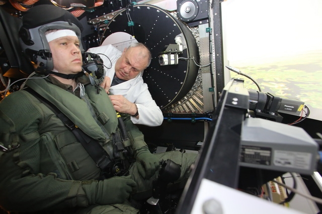 Ruhig zieht Schnitger den Steuerknüppel nach hinten. Die Cockpitgondel beschleunigt und rast im Kreis, die G-s nehmen stetig zu. Unter der Atemmaske verzieht sich das Gesicht und seine weit geöffneten Augen lassen die Anstrengung erkennen. Unerbittlich lastet die Schwerkraft auf dem Körper, aber der AEA-Anzug mit der Anti-G-Hose und die Druckbeatmung helfen ihm gegen das Neunfache Körpergewicht, das jetzt auf ihm lastet. Nach 15 Sekunden hat er es geschafft und bringt den Steuerknüppel wieder in Neutralstellung. Sein erster Kommentar danach: „Zwischen 7 G und 9 G ist nochmal ein gewaltiger Unterschied. Auch wenn wir im Eurofighter nicht immer an das Limit von 9 G gehen, so ist das Training hier in Königsbrück äußerst wertvoll und unverzichtbar. Zusammen mit den Erfahrungen in der Druckkammer und den Unterrichten und Demonstrationen zu räumlicher Desorientierung, Nachtsicht und Laserschutz sind die Lehrgänge in Königsbrück ein sehr wichtiger Beitrag zur Flugsicherheit, der alle vier Jahre neu sensibilisiert und das Wissen wieder auffrischt.“ Ähnlich sieht es auch Oberstleutnant Marco Mehling (39), der sich besonders für das Phänomen der Räumlichen Desorientierung interessiert. Als Tornado Pilot ist er beim Tornado Avionics Integration Support Team (TAST) in Manching tätig und begleitet Weiterentwicklungen die den Tornado betreffen. Er ist zum fünften Mal in Königsbrück und schätzt die Ausbildungseinrichtungen des Flugphysiologischen Trainingszentrums der Luftwaffe ebenfalls.