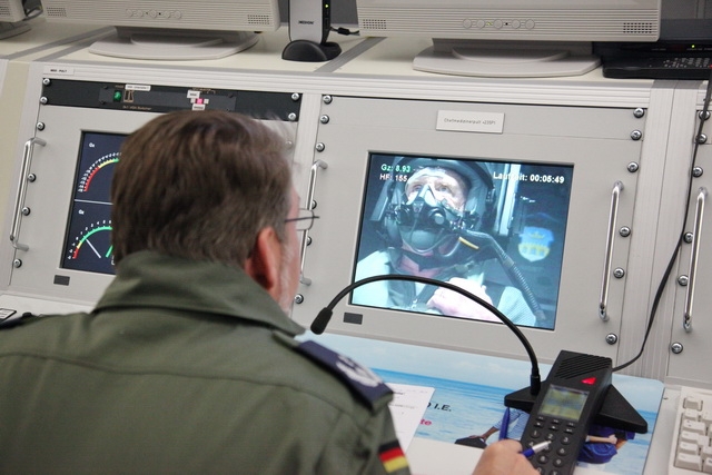 So schildert es Oberfeldarzt Dr. Michael Nehring (53). Er ist stellvertretender Leiter des Flugphysiologischen Trainingszentrums der Luftwaffe und Leiter der Ausbildung und beschreibt die Aufgaben seiner Dienststelle so: „Wir sind hier in Königsbrück ständig bestrebt den Lehrgangsteilnehmern ein optimales Training zu bieten. Dabei stehen Einsatzfähigkeit und Flugsicherheit an oberster Stelle. In mehr als 160 Lehrgängen betreuen wir jährlich über 1700 Lehrgangsteilnehmer aus dem In- und Ausland. Hinzu kommt noch die Beteiligung an nationalen und internationalen Forschungsprojekten in Zusammenarbeit mit dem Deutschen Zentrum für Luft- und Raumfahrt (DLR), der Sporthochschule Köln, der Universität Dresden und anderen Institutionen. Was unsere technischen Einrichtungen betrifft, so sind wir derzeit auf neuestem Stand, denn nach der Modernisierung der Humanzentrifuge im Jahre 2005/2006 ist nun auch unsere Höhen-Klima-Simulationskammer im Jahr 2012 dem Stand der Technik angepasst worden. In der Zeit der Revision konnten wir die Ausbildung in der Unterdruckkammer in Kooperation mit dem Flugmedizinischen Institut der Tschechischen Luftwaffe in Prag fortführen. Weiterhin haben wir uns mit der Einrüstung eines zweiten Disorientierungstrainers (Airfox DISO 2) und der Aufnahme eines Nachtsehlehrganges in den Lehrgangskatalog dem Bedarf angepasst. Damit stehen wir im internationalen Vergleich ganz vorne“, berichtet Oberfeldarzt Dr. Nehring und ergänzt: „Wir hoffen, dass wir in der Zukunft die Lehrgangsinhalte der unterschiedlichen Bereiche der Flugphysiologie weiterhin zeitgerecht an die aktuellen Erfordernisse anpassen können und speziell simulationstechnisch auf dem neuesten Stand bleiben, um unsere Stellung als Kompetenzzentrum der Luft- und Raumfahrtmedizin in Europa weiter auszubauen.