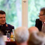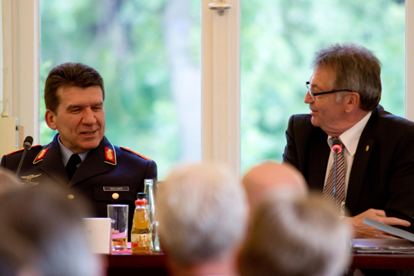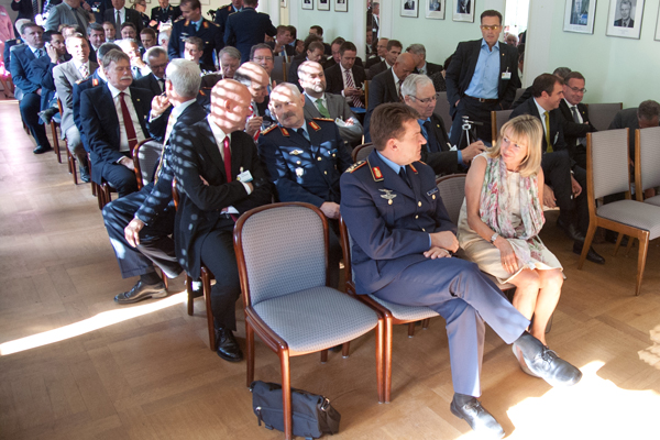 General Müllner gab zudem einen Überblick zu den Waffensystemen der Luftwaffe. Er hob besonders das Projekt „Leistungstransfer Drehflüger“ hervor. Bei diesem komplexen Projekt übernahm die Luftwaffe die Verantwortung und die Zuständigkeit für alle Transporthubschrauber vom Typ CH-53 von der Teilstreitkraft Heer und übergab im Gegenzug die Hubschrauber Bell UH-1D und NH90. Mit etwas Wehmut wies der ehemalige Kampfjet-Pilot auf den letzten Flug der Phantom F-4F hin. „Über Jahrzehnte war die Phantom ein verlässliches und leistungsstarkes Waffensystem“, so Müllner, der selbst seine fliegerische Laufbahn im Cockpit dieses Kampfjets durchlaufen hat. Mit einem Tag der offenen Tür auf dem Fliegerhorst Wittmund am 29. Juni 2013 wird die Phantom in den Ruhestand geschickt. Zum Abschluss seiner Rede stellte sich Generalleutnant Karl Müllner noch den Fragen der Gäste. Der Präsident der IDLw, Generalmajor a.D. Winfried Gräber, dankte dem Inspekteur für die offenen Worte und den interessanten Vortrag. Müllner lobte das Engagement der IDLw für die Luftwaffe. Mit diesem gelungenen Abend konnte ein Satzungsziel der IDLw erreicht werden. Es wurde eine Plattform für alle Interessenten aus Politik, Gesellschaft, Wirtschaft, Forschung und Lehre geschaffen. Man konnte sich über aktuelle Fragen der militärischen Luft- und Raumfahrt mit den Spitzenvertretern der Luftwaffe austauschen.