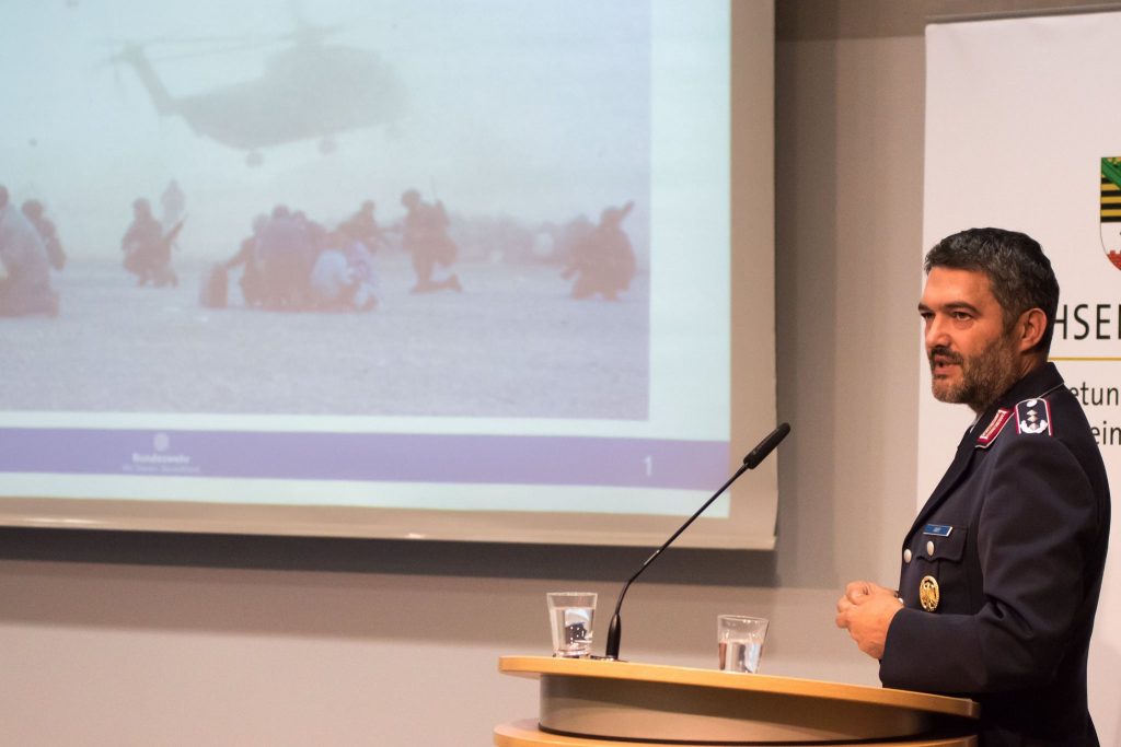 Anhand von authentischen Beispielen, die der Vortragende in seiner Verwendung im Einsatzführungskommando aktiv geplant und miterlebt hatte, erklärte Gräfe die Rahmenbedingungen, unter denen eine Evakuierung deutscher Staatsbürger verläuft. „Unser Staat muss auf alle möglichen Situationen zum Schutz DEU Staatsangehöriger im Ausland reagieren können“, erläuterte er. Art und Umfang der Reaktion hängen immer von der jeweiligen Sicherheitslage ab. Bei geringer Bedrohung erfolge eine Schnelle Luftabholung in Unterstützung der Diplomatischen Evakuierung des Auswärtigen Amts. Dies sei beispielsweise im Sommer 2016 im Südsudan der Fall gewesen.