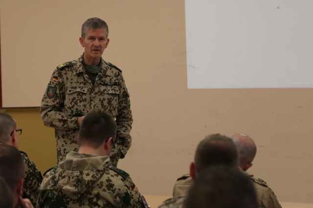 Für den Kommandeur Kommando Einsatzverbände, Generalleutnant Martin Schelleis, sind solch umfangreiche personelle und strukturelle Veränderungen Anlass eines Truppenbesuchs um Sachstandsinformationen aber auch Probleme aus erster Hand zu erfahren. Im größten Besprechungsraum des TAAC N (Train Advice and Assist Command North) im Camp Marmal, nahe der nordafghanischen Stadt Mazar-e Sharif traf er 70 Luftwaffensoldaten des Kontingents. Der Dreisternegeneral informiert ausführlich über die Lage in den Einsatzgebieten, in denen Soldaten der Luftwaffe derzeit ihren Dienst versehen. Im Verlauf seines Vortrags spannt er weiterhin den Bogen von der Ausbildung in der Luftwaffe bis zum aktuellen Stand von Rüstungsprojekten. Weitere Themen sind Strukturmaßnahmen in der Heimat und die hohe Einsatzbelastung von Personal und Material: „Einsätze sind, auch wenn es in Art und Umfang weniger werden, nach wie vor eine entscheidende Stellschraube im täglichen Dienstbetrieb zuhause.“ Zum Abschluss dankt Schelleis den Anwesenden für ihr Engagement: „Sie leisten hier wirklich Hervorragendes. Mit diesem Besuch möchte ich Ihnen auch meinen Respekt und meine Anerkennung für die geleistete Arbeit erweisen.“