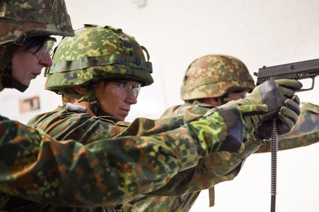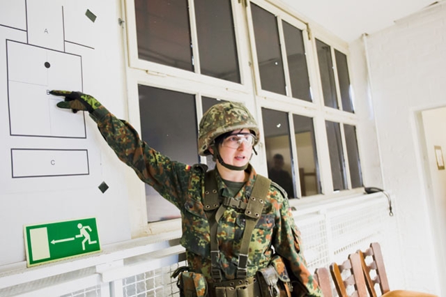Wir treffen Oberfeldwebel Nadja Abraham. Sie ist gerade hochkonzentriert. „Bahn 1 bis 6 – klar zum Gefecht – ein Ziel links – zweimal ein Doppelschuss – Kontaktstellung – FEUER“. Nadja ist gerade damit beschäftigt, eine 6-köpfige Gruppe in der Waffen- und Schießausbildung zu unterweisen. Alle hören auf ihr Kommando. „Übungsende!“ Als Luftwaffensicherungsfeldwebel ist sie auch Schießlehrerin. „Das macht mir richtig Freude. Mir gefällt es, dass ich Soldatinnen und Soldaten aller Dienstgradgruppen mein Wissen vermitteln darf.“ Und das macht sie richtig gut. „Alle aktiven Mitglieder der Bundeswehr müssen ständig ein Mindestmaß an militärischen Grundfertigkeiten beherrschen. Ich bringe ihnen diese bei. Und da gehört nicht nur das Schießen dazu.“ Dazu gehört auch das Marschieren, die ABC-Schutzmaßnahmen und die körperliche Leistungsfähigkeit.