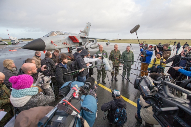 Kurz nachdem der Bundestag dem Antrag des Kabinetts zugestimmt hat, übertrugen bereits die Nachrichtenagenturen erste Livebilder vom Medientag auf dem Flugplatz Jagel. Der Kommodore des Geschwaders, Oberst Michael Krah, begrüßte rund 60 Medienvertreter und stellte sich allen Fragen der Journalisten. Dass es schnell gehen kann, musste auch der Verband lernen. Oberst Krah befand sich noch vor wenigen Wochen mit seinen Soldaten in Spanien. Sie nahmen dort an einer NATO-Übung teil, die umgehend beendet wurde, um einen möglichen Einsatz des Geschwaders vorzubereiten.