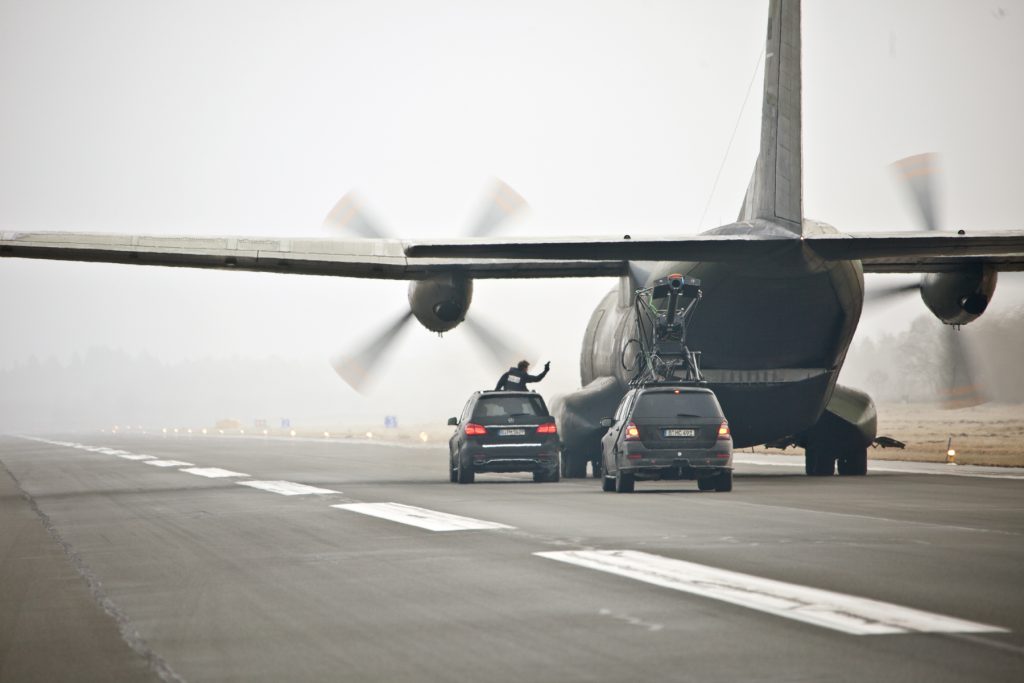 Nur mit strengen Sicherheitsrichtlinien war möglich, was im alltäglichen Flugbetrieb der Hohner undenkbar wäre. Eine große Drohne mit Kamera nur wenige Meter neben der rollenden Transall. Dahinter einige Fahrzeuge mit Stuntman, Spezialfahrzeuge mit den Kameras und natürlich Sicherheitspersonal vom Flugplatz. Eine seltene Möglichkeit für den Regisseur des Films, Torsten Künstler: „Wir bekommen hier Material zur Verfügung gestellt, das wir normalerweise nicht haben. Ein Flugzeug in der Größenordnung ist sonst nicht möglich. Durch die Kooperation mit der Bundeswehr hat das super funktioniert. Da sind wir sehr glücklich drüber.“