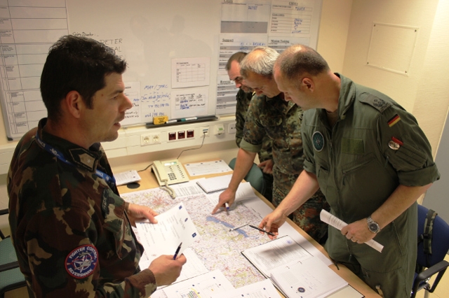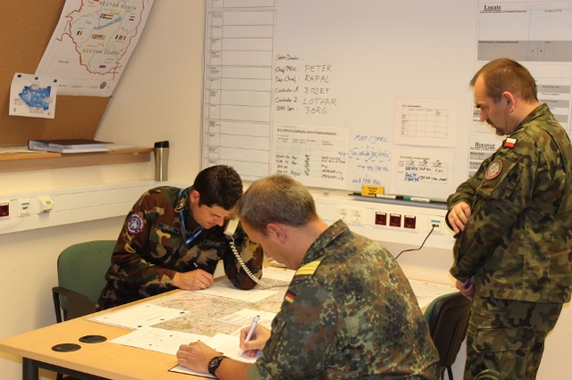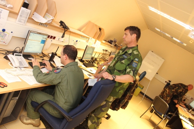 Die Frauen und Männer im engen Lageraum sitzen hoch konzentriert an ihren Arbeitsplätzen, der Schichtführer nimmt Verbindung zu seiner vorgesetzten Dienststelle in Györ (Ungarn), dem Joint Personnel Recovery Center (JPRC), auf. Die bestätigt den Funkspruch und den Vorfall. Dann wird die weitere Verantwortung dem PRCC übertragen. Der PR-Schichtführer informiert den Leiter der JOC (Joint Operations Cell), der gemeinsamen Operationszentrale. Parallel fordert er ein Lagebild über die Situation und eine stabile, gesicherte Funkverbindung zu Kräften vor Ort an. Der Rettungseinsatz, – dieses Mal glücklicherweise nur ein Lehrgang-, ist eingebettet in das Szenario „Balatonia“, angepasst an die Region um den Plattensee. Ein typisches Szenario der heutigen Zeit, asymmetrisch und mit undurchsichtigen Konfliktparteien, dabei jedoch fiktiv, wie man es aus vielen Übungen kennt: zwei JAS 39 Gripen der Ungarischen Luftwaffe werden bei einem Aufklärungsflug nördlich des Plattensees mit tragbaren Luftabwehrraketen beschossen. Dabei wird eine Maschine getroffen und stürzt ab. Der Pilot kann sich mit dem Schleudersitz retten.