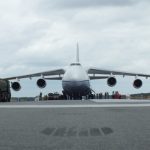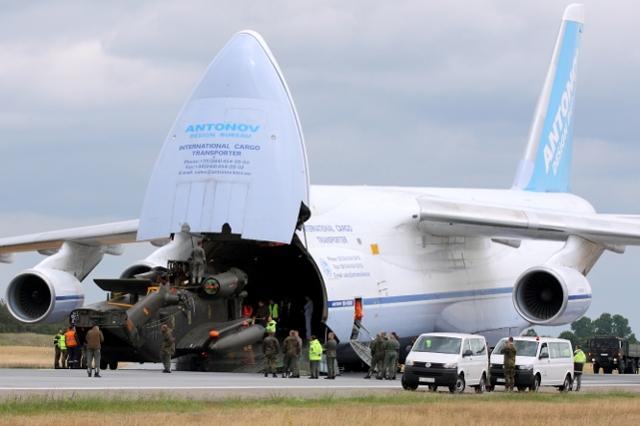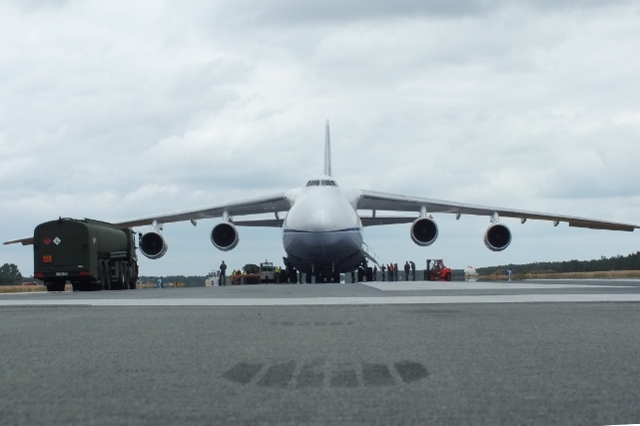 Das Medieninteresse war gewaltig. Kameras, Soldaten und unzählige Zaungäste blickten gespannt in den grauen Himmel, als die gewaltige Antonov einschwebte. Noch niemals zuvor war ein so großes Luftfahrzeug auf dem Fliegerhorst in Holzdorf gelandet. Gegen 12 Uhr näherte sich die Maschine aus Richtung Osten und setzte sicher auf der Landebahn auf. Oberstleutnant Jürgen Haupenthal, Kommandeur der Lufttransportgruppe des HSG 64 in Holzdorf, war glücklich und erleichtert: „Das war Spitze, hiermit haben wir Geschichte geschrieben. Das HSG 64 ist in der Lage, seine Hubschrauber weltweit in den Einsatz zu verlegen. Durch die heutige Landung haben wir diese Fähigkeit nachgewiesen. Ich bin stolz auf meine Truppe, die das geleistet und möglich gemacht hat“, sagte Haupenthal. Der Kommodore des HSG 64, Oberstleutnant Stefan Demps, gratulierte Haupenthal zu diesem erfolgreichen Tag während die Antonov entladen wurde. „Ich erwarte mir für das Geschwader neue Fähigkeiten, die Ressourcen schonen und eine höhere Flexibilität in der Operationsführung eröffnen“, erläuterte Demps.